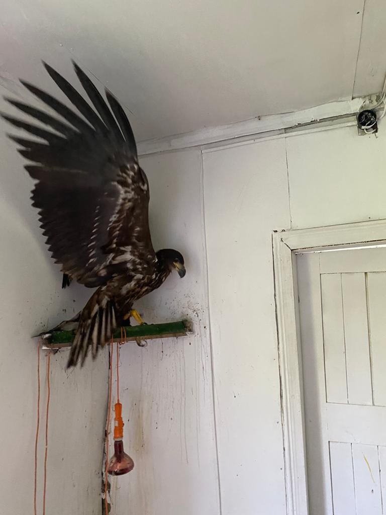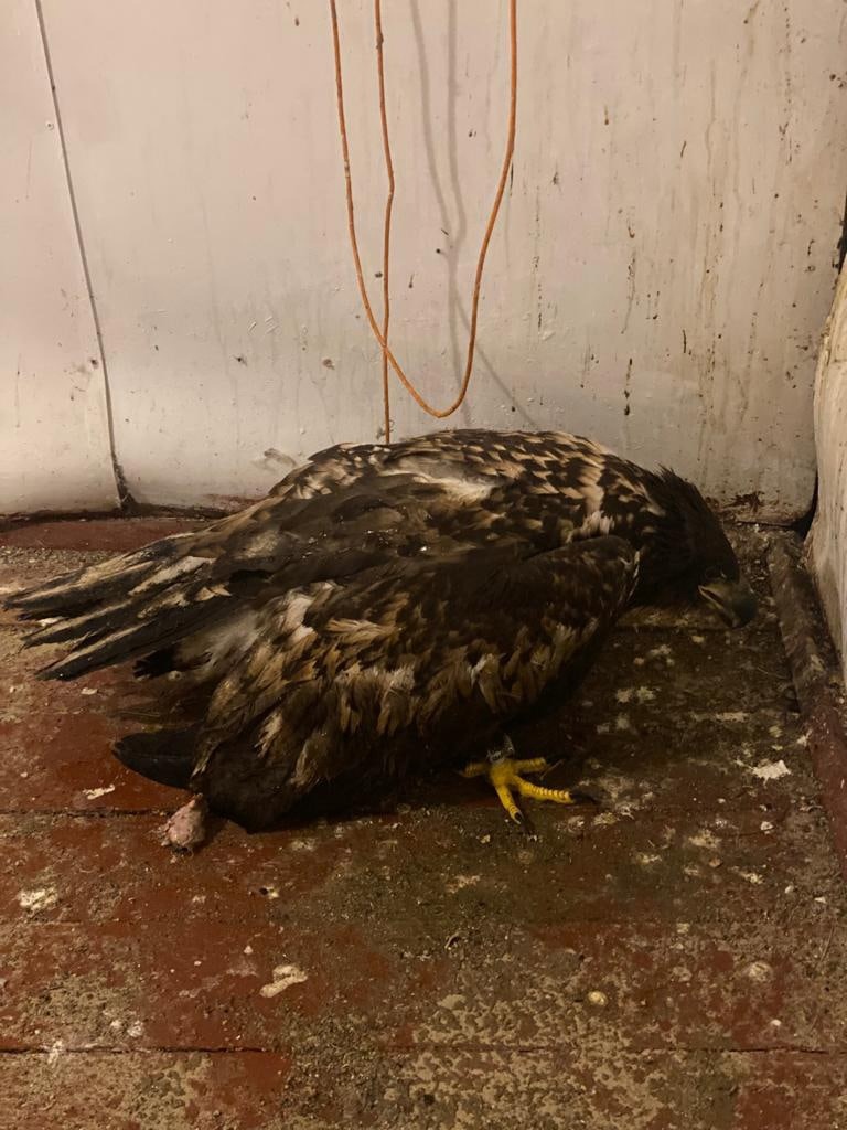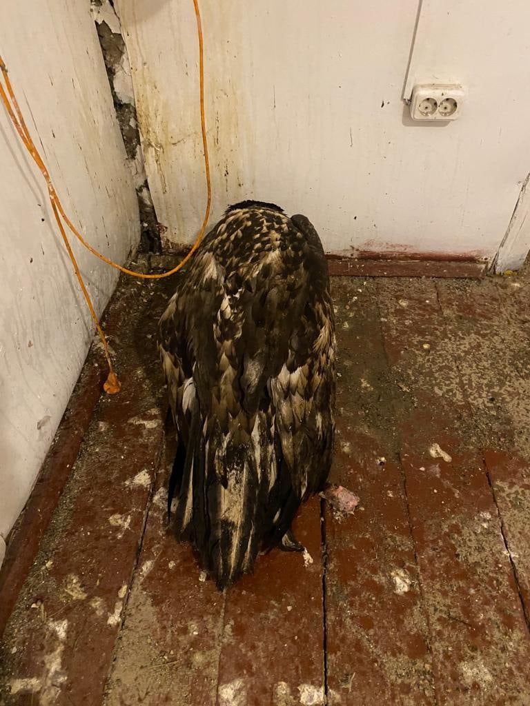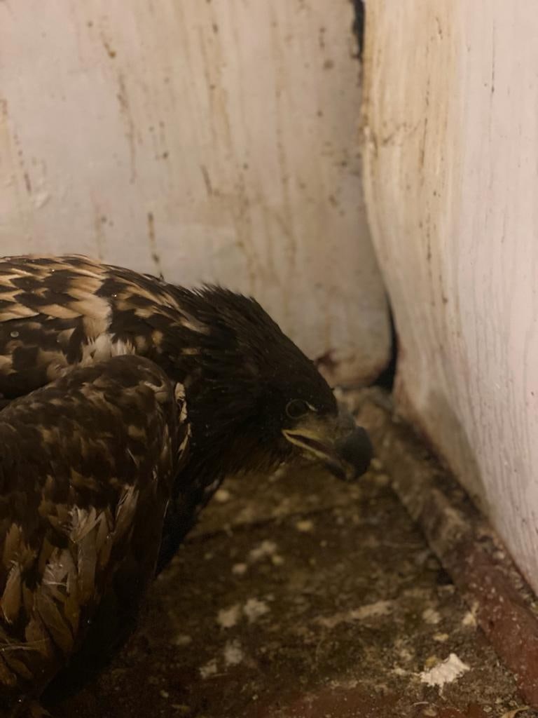 Орлан уже пошел на поправку. Птица была очень ослаблена, сильно исхудавшая. Даже не могла долго стоять. За неделю орлан уже ожил, начал есть, пробует летать.