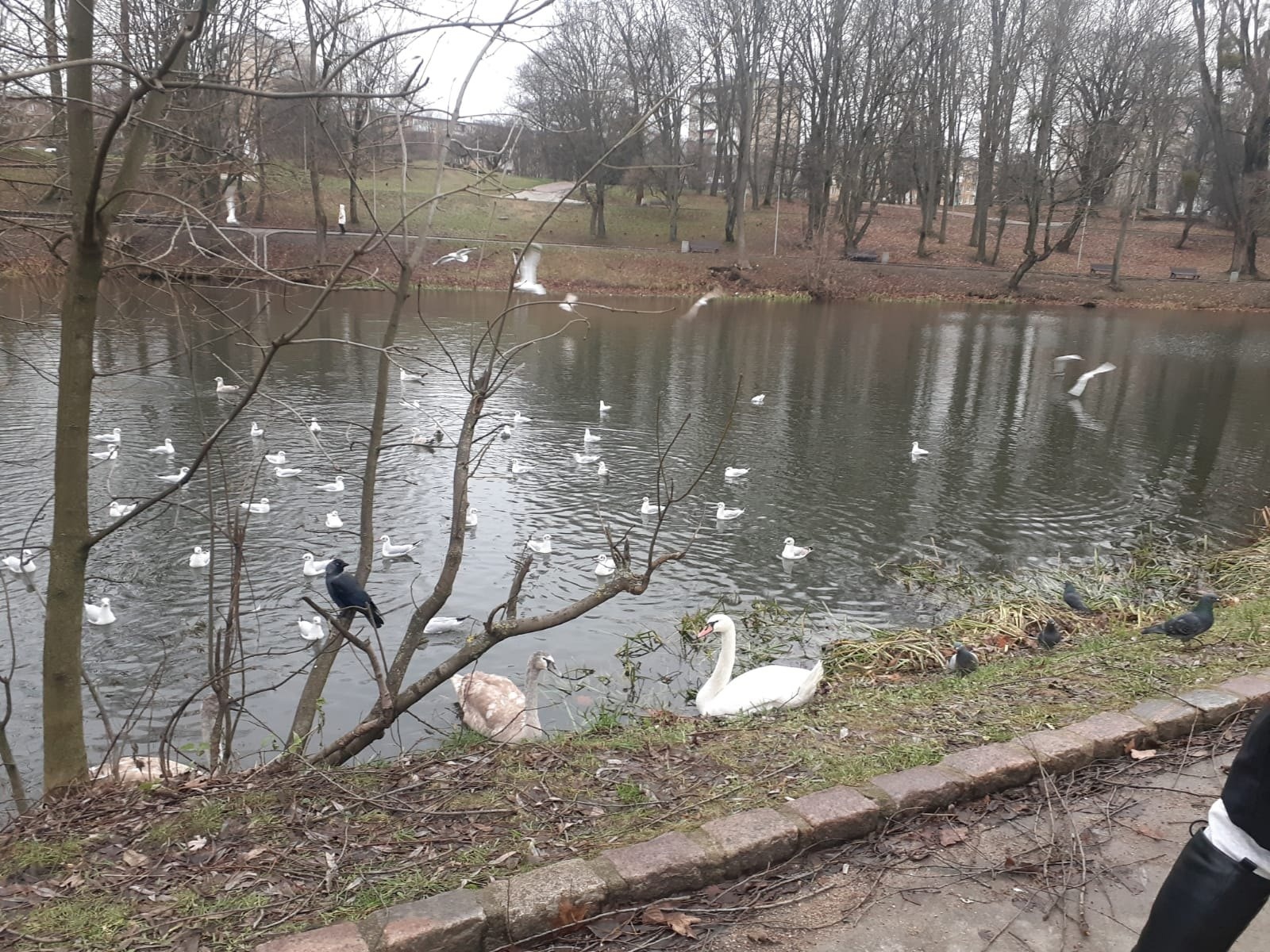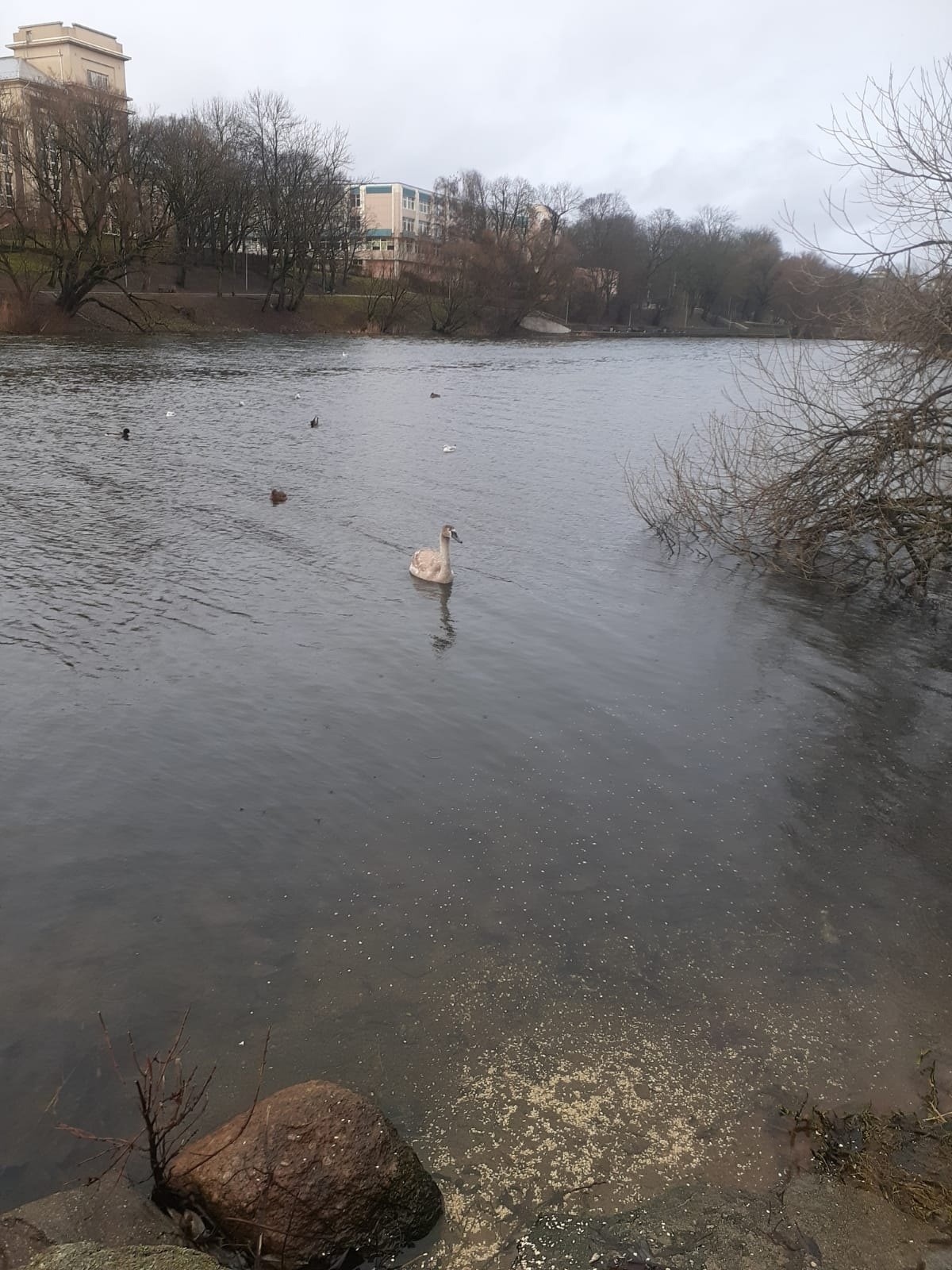 Всю осень Наталья подкармливала лебедиху с двумя птенцами. А к Новому году, когда вокруг стали взрывать петарды и фейерверки, двое лебедей улетели. Но этот, лебеденок, ещё серого окраса, остался один.