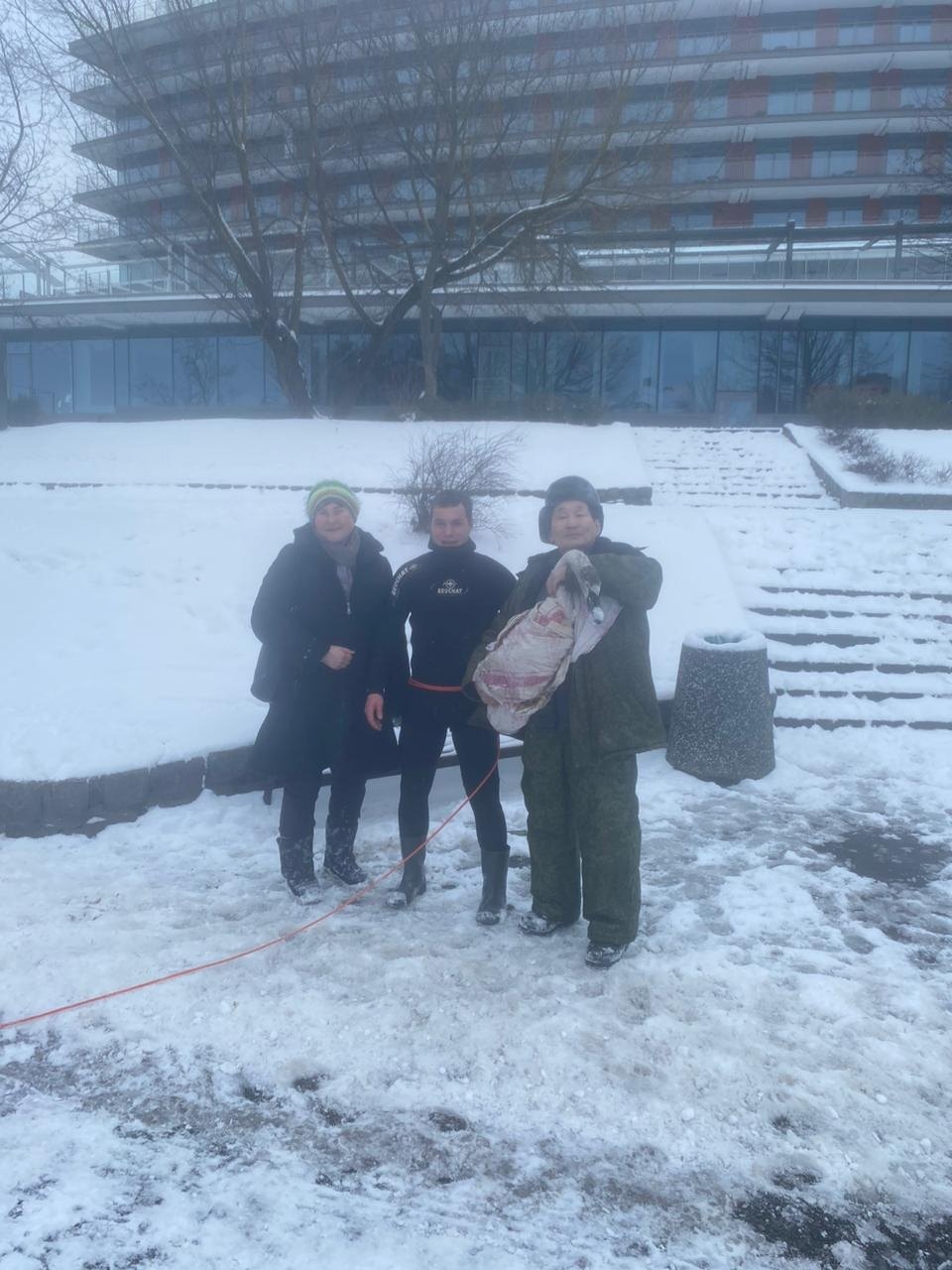 В результате, приехала целая команда. Спасателем, впервые выступил Вячеслав, отзывчивый и храбрый молодой человек. Он на страховке, в гидрокостюме, пробрался к лебедю по непрочному льду. Несколько раз проваливался в воду, но смог вытащить птицу и благополучно выбрался сам.