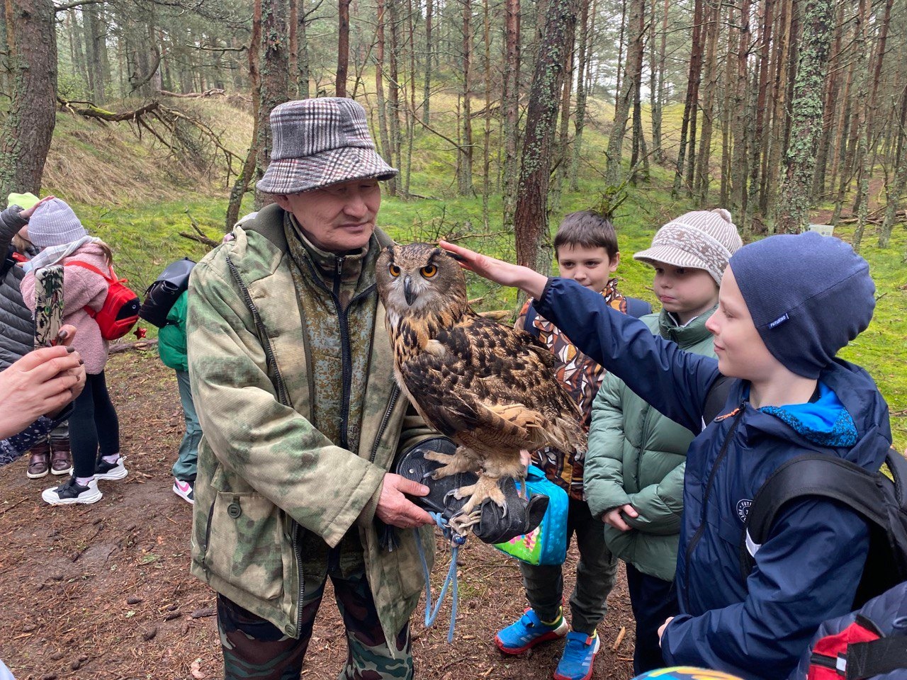 Наша практическая часть занятия оказалась сокровищницей эмоций и восторга. У подножья Высоты Эфа, при участии настоящих экспертов — Алексея Афанасьевича Лаврентьева, руководителя Клуба любителей соколиной охоты «Бусидо», сокола Дайме и филина Золотца, дети смогли окунуться в мир настоящей природы, ощутить ее неповторимое величие и узнать, как важно беречь ее богатства.