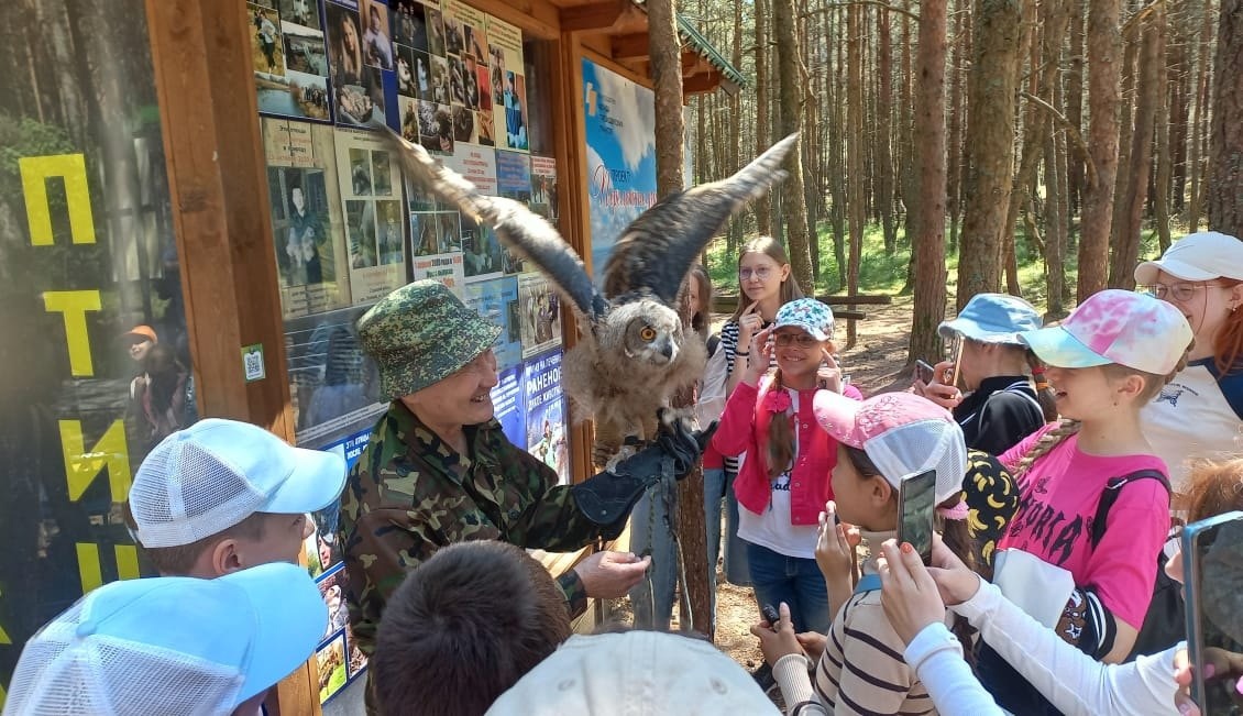 Светлана Афанасьевна показала детям вольеры, в которых живет молодая семья филинов. В этом году у них появилось три очаровательных филиненка. Она рассказала, насколько филины заботливые родители, как они охраняют и защищают свое потомство. Однако главным событием этого дня стало то, что ребята впервые смогли увидеть маленького филиненка. Дети проявили невероятное уважение и бережное отношение, тихо подошли к вольерам, и филины в знак доверия показали им своего малыша.