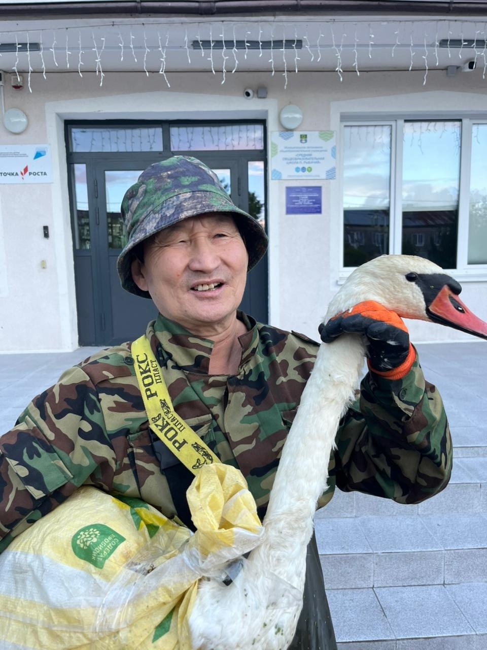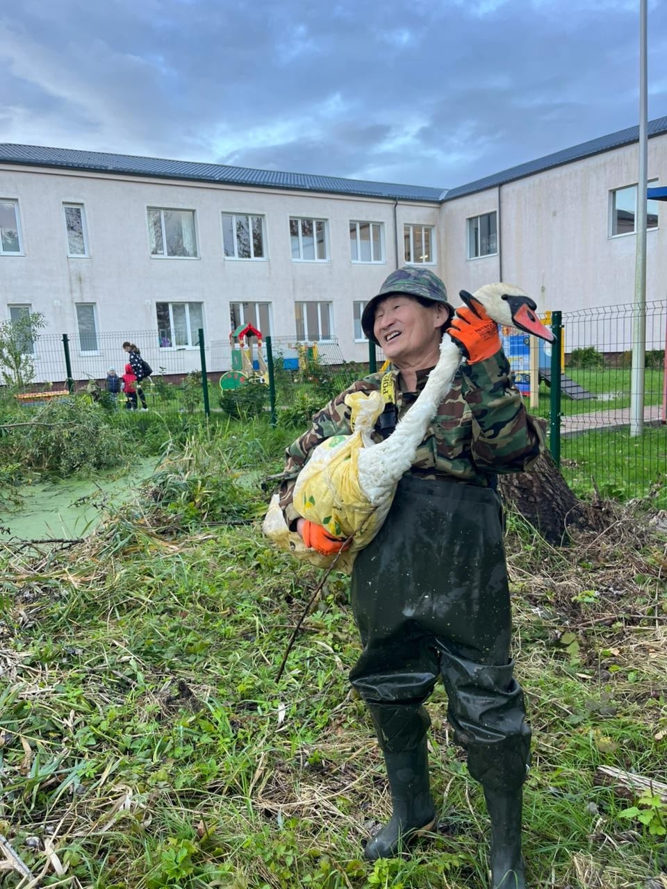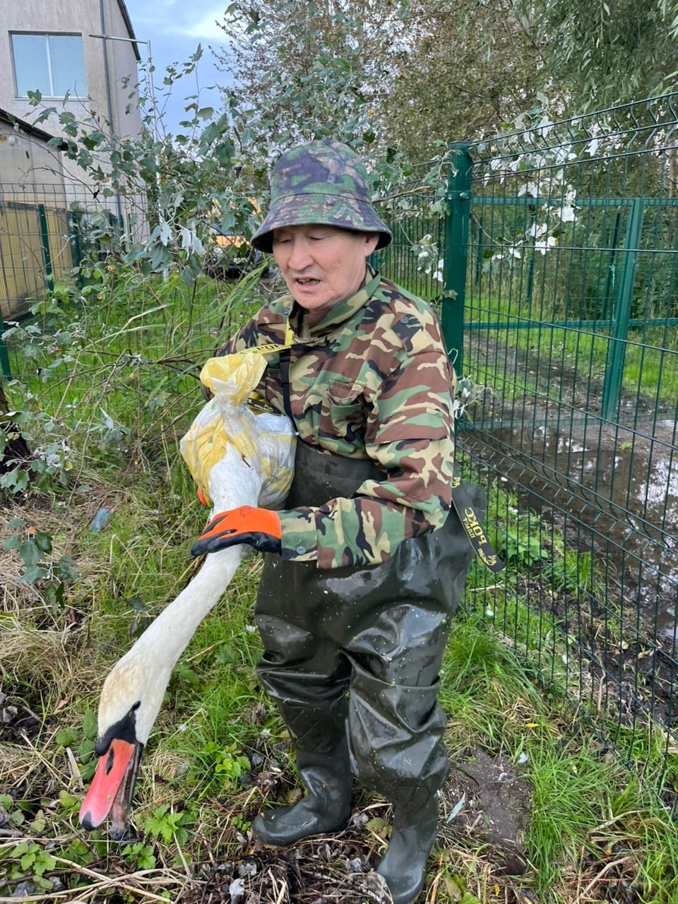 Первыми тревогу забили неравнодушные родители малышей, которые заметили птицу в беде. Весь день они ждали подмогу, и на следующий день нам в Клуб любителей соколиной охоты «Бусидо» сообщили о происшествии. Наш руководитель, Алексей Афанасьевич Лаврентьев, незамедлительно выехал на место. Добраться до лебедя было непросто — в озере оказалось глубоко, но ему удалось аккуратно вызволить птицу из зелёного плена.