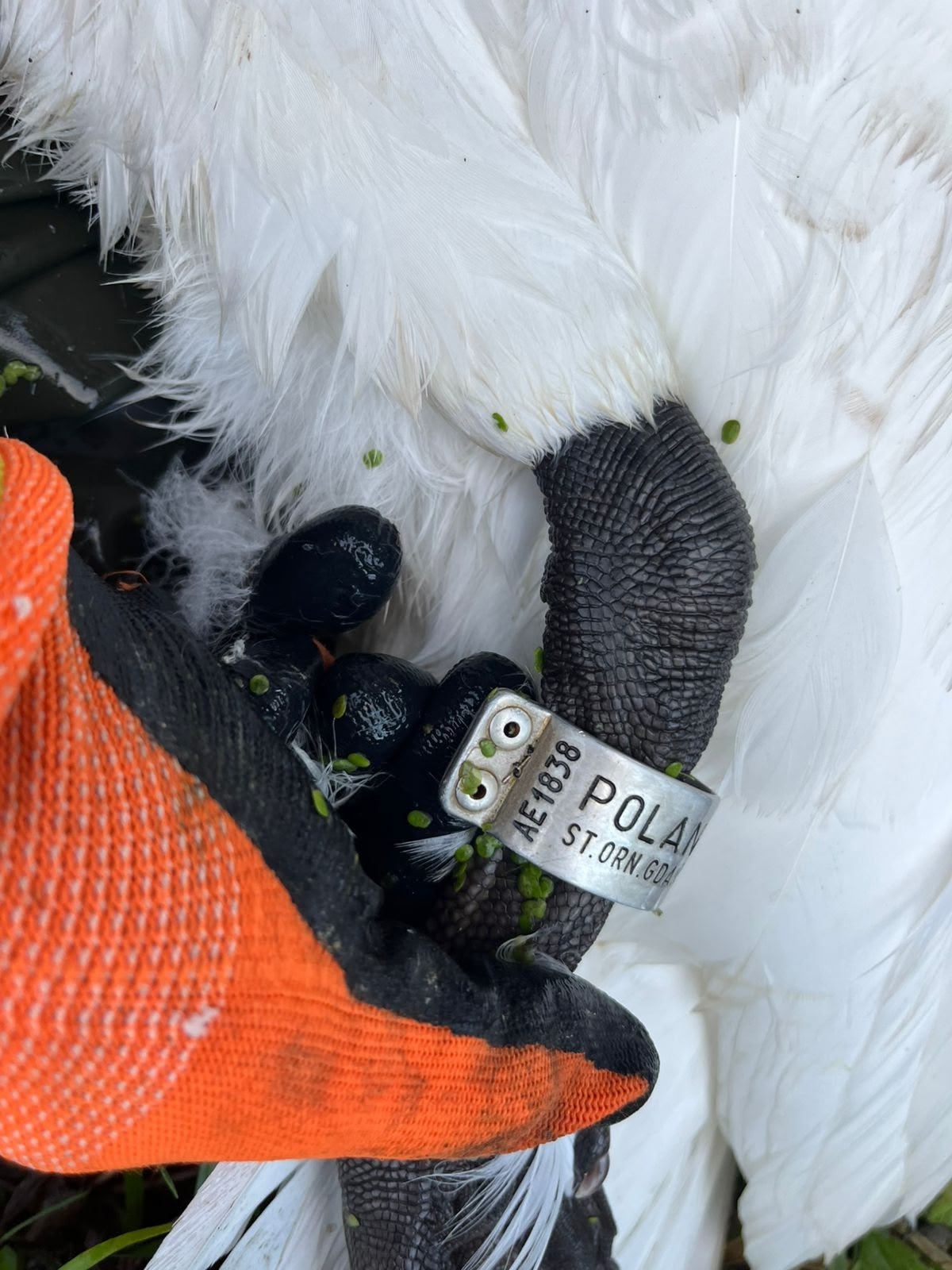 Лебедь был осмотрен: он оказался абсолютно здоров и полон сил! На его лапе мы обнаружили кольцо польской орнитологической службы. Мы отвезли красавца на большой водоём, где он теперь готовится к дальнейшему перелёту.